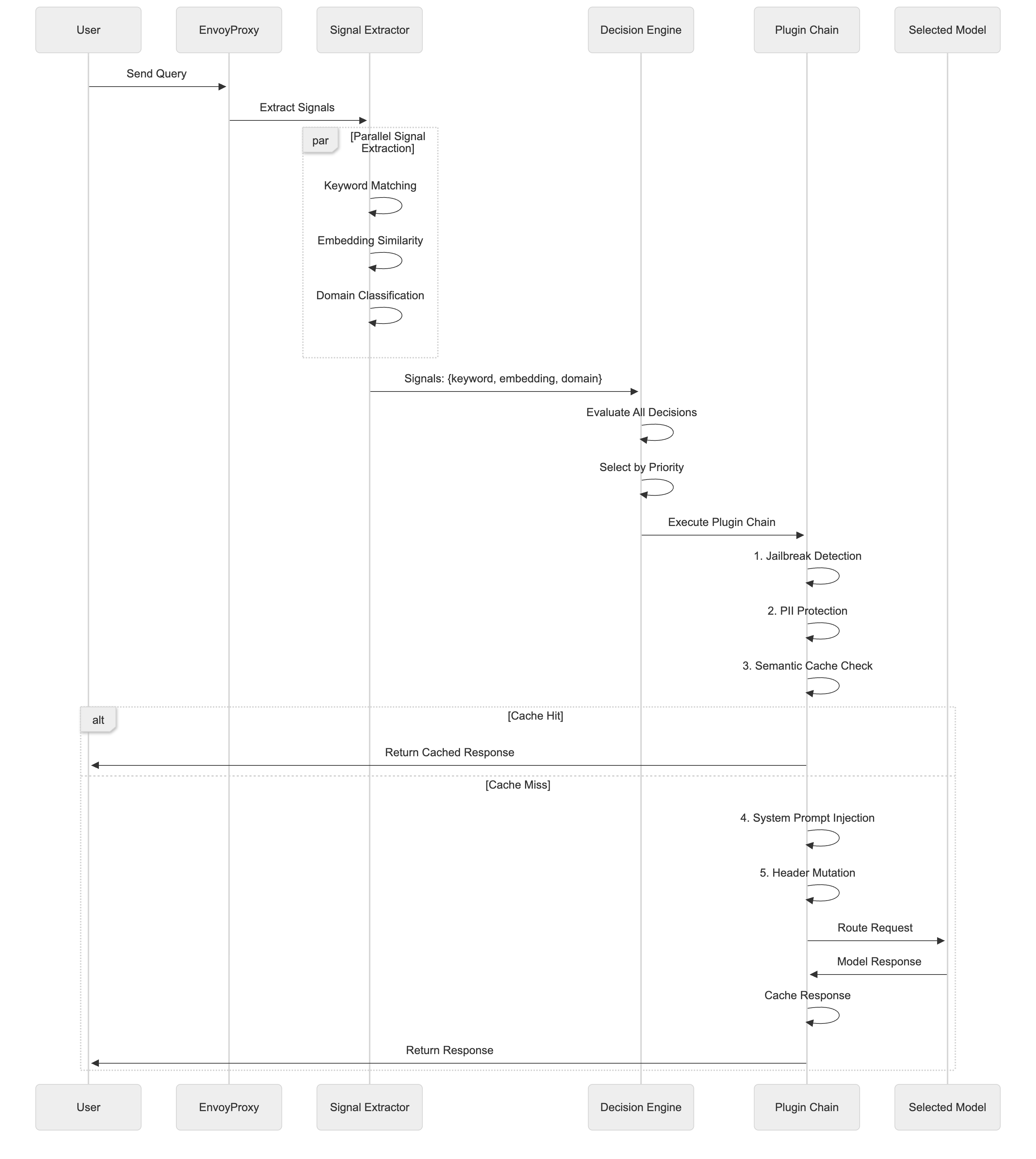 The Signal-Decision Architecture fundamentally reimagines semantic routing by separating signal extraction from routing decisions and introducing a flexible decision engine with built-in plugin orchestration.